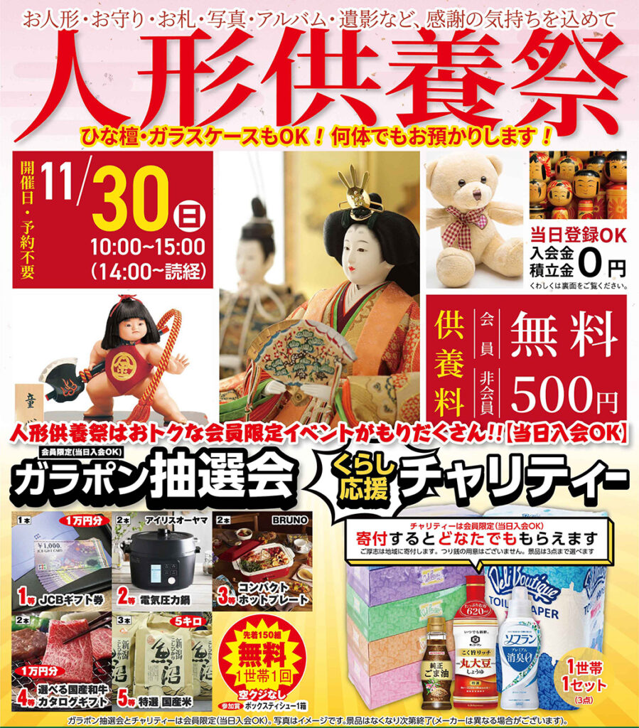 武蔵村山市にある家族葬の長坂 武蔵村山にて「人形供養祭」を開催いたします!大切にしてきたもののなかなか手放せないお人形やぬいぐるみを、地元住職が心を込めて丁寧にご供養いたします。午前10時よりお人形のお預かりを開始、14時より住職による読経を執り行います。ぜひご参列ください。さらに大人気!「会員様向けガラポン抽選会」(先着150組)や「チャリティイベント」も同時開催いたします。ご予約不要・参加無料のイベントですのでご家族やご友人とお誘い合わせのうえ「武蔵村山」へお気軽にお越しください。