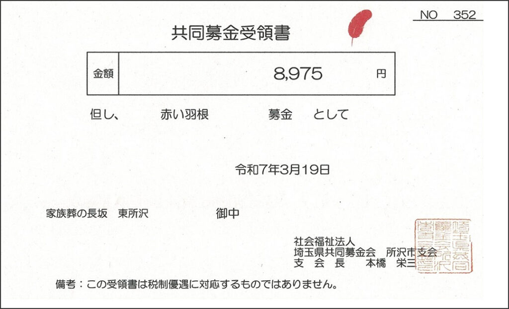 家族葬の長坂 東所沢会館より、上記金額を埼玉県共同募金会 所沢市支会へ寄付をさせていただきました事をご報告いたします。