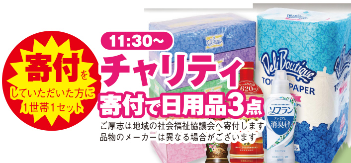 寄付をしていただいた方へ日用品3点をプレゼント!社会貢献もしながら、常備品としても役立つ日用品を手に入れるチャンスです。当日をお楽しみに!※画像はイメージです。